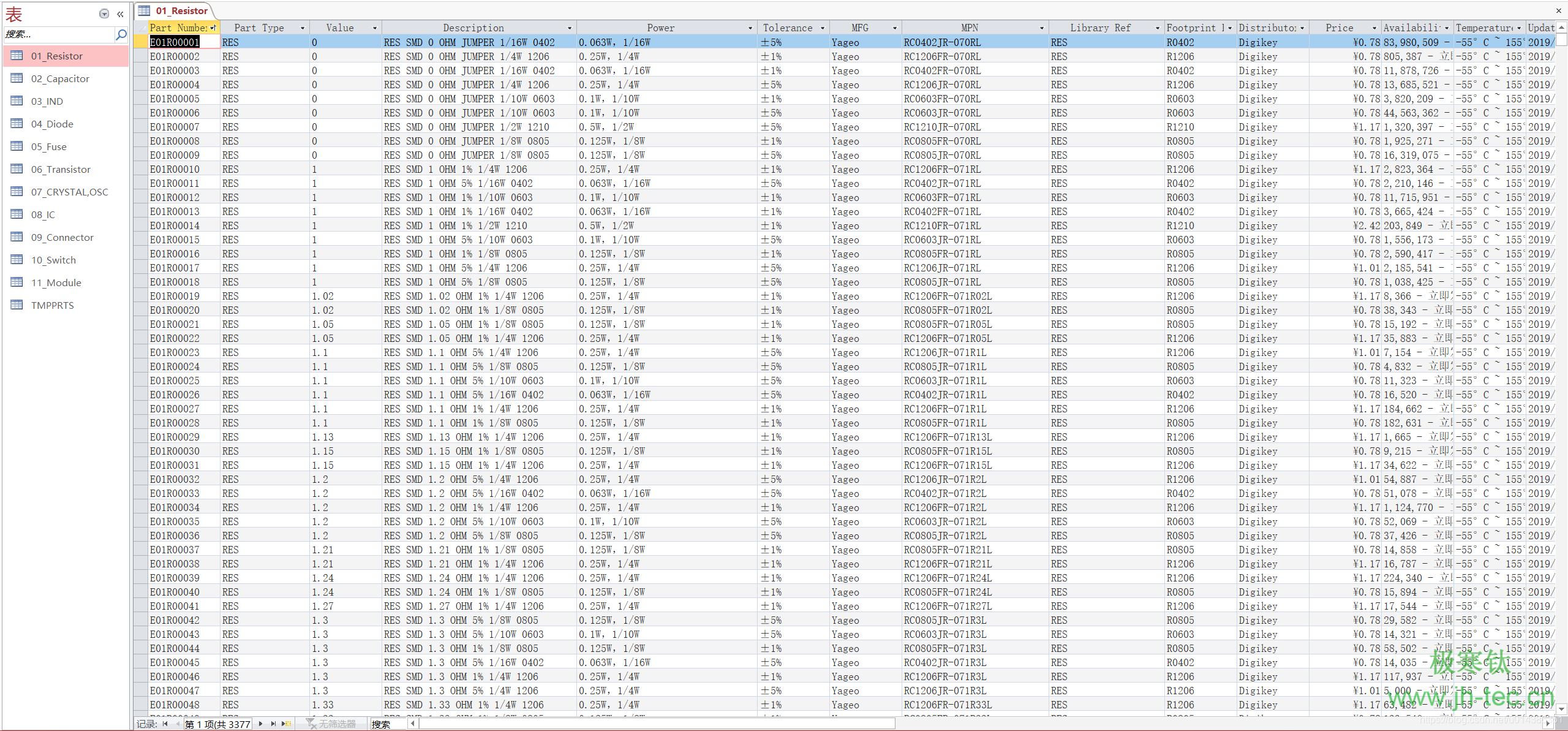 数据库包含0Ω~10M不同封装不同精度的电阻、0.1pF~200uF不同封装不同耐压值的电容、0.3nH~680uH不同封装不同类型的电感,以及其他一些常用的二极管,MOS管,晶振,IC,连接器等。