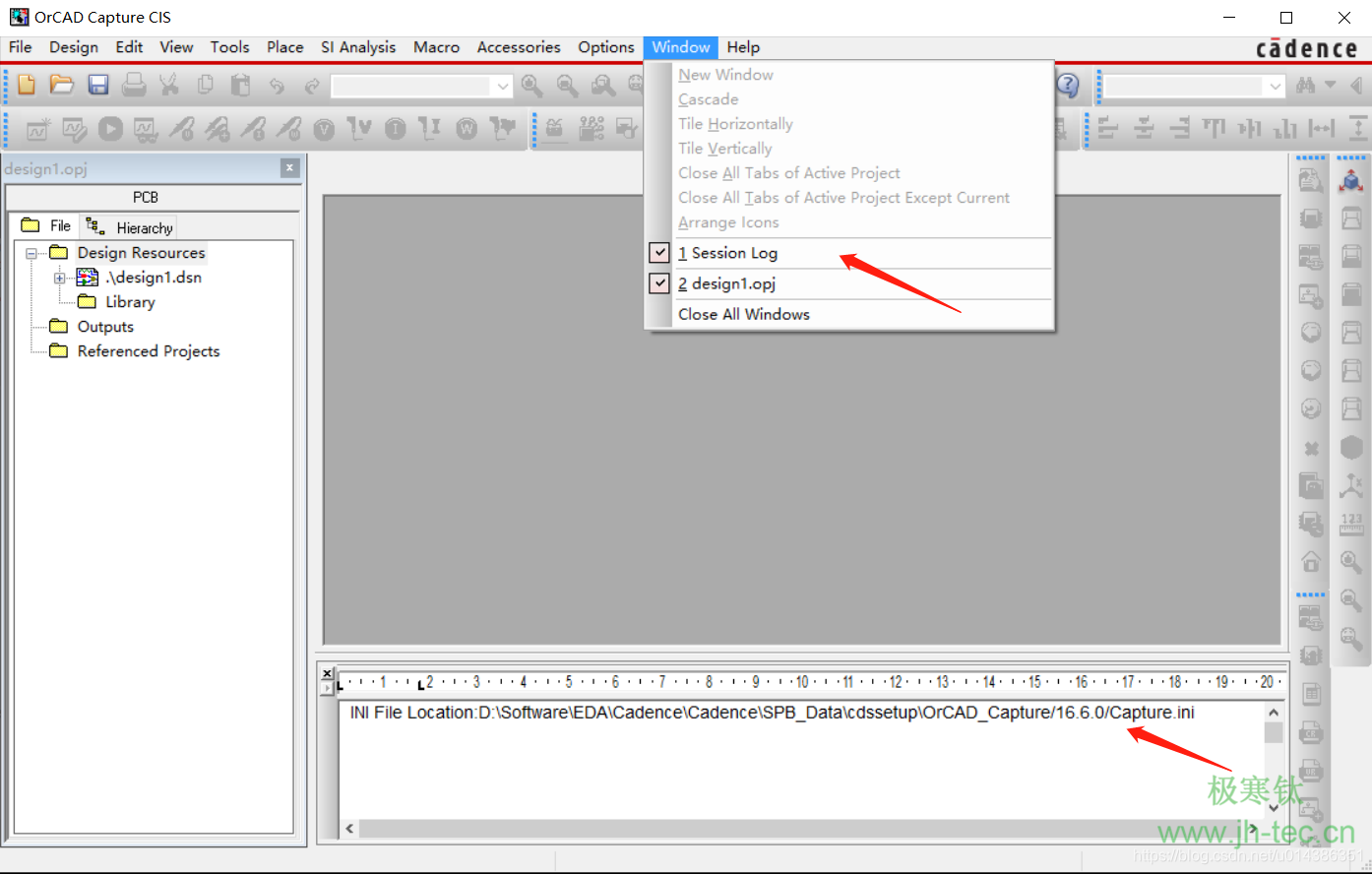 9)在session log窗口找到Capture.ini文件的位置,然后打开Capture.ini文件,添加原理图库的位置(可同时添加PCB Footprint的位置)。