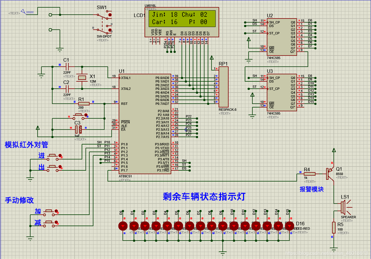 基于红外对管的车位检测系统,两个按键模拟红外对管,LCD显示剩余的车位,具有LED指示,车辆超出后蜂鸣器报警提示;